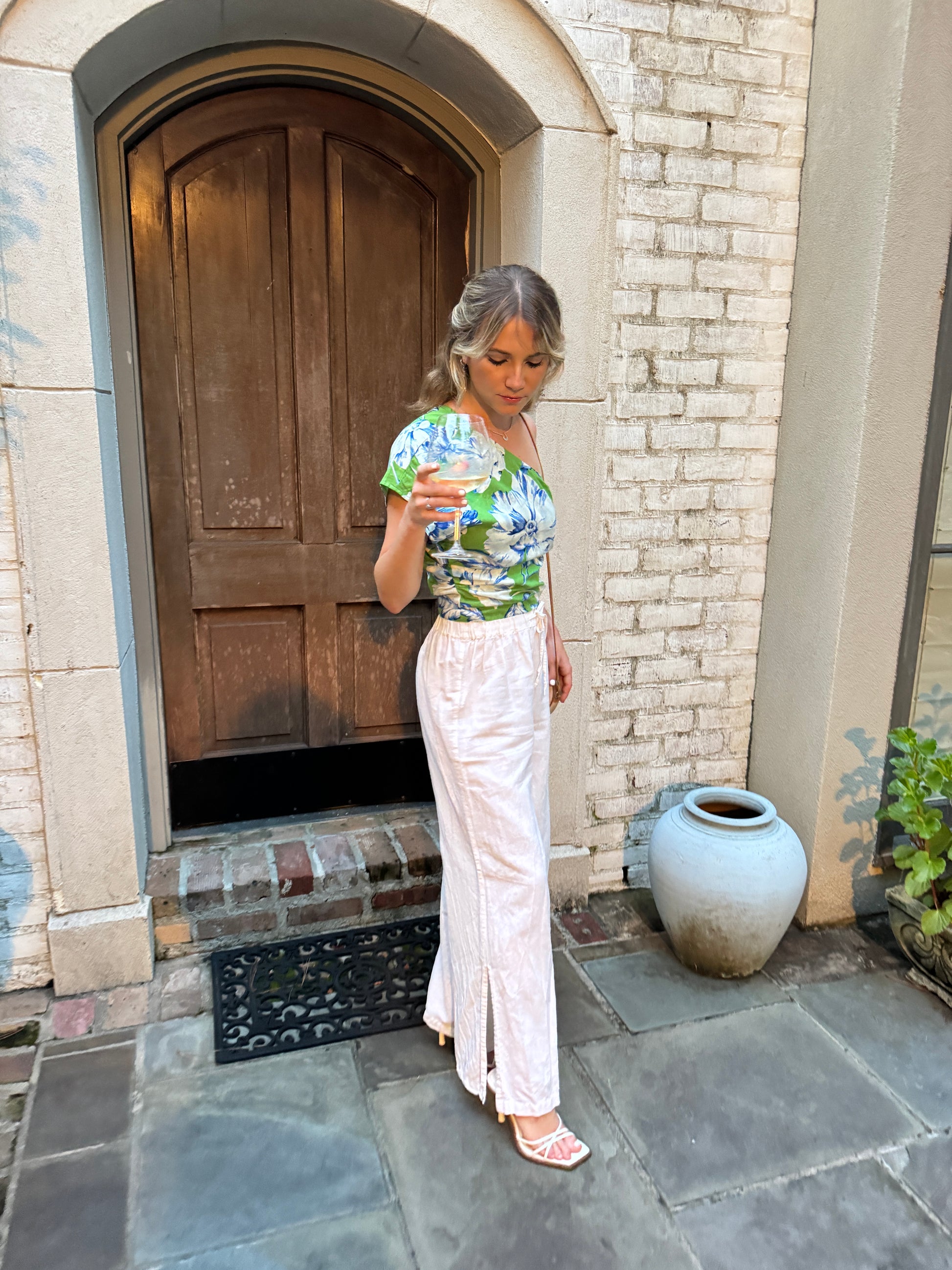 Our Amanda One Sleeve Top features an one sleeve and a zipper closure.