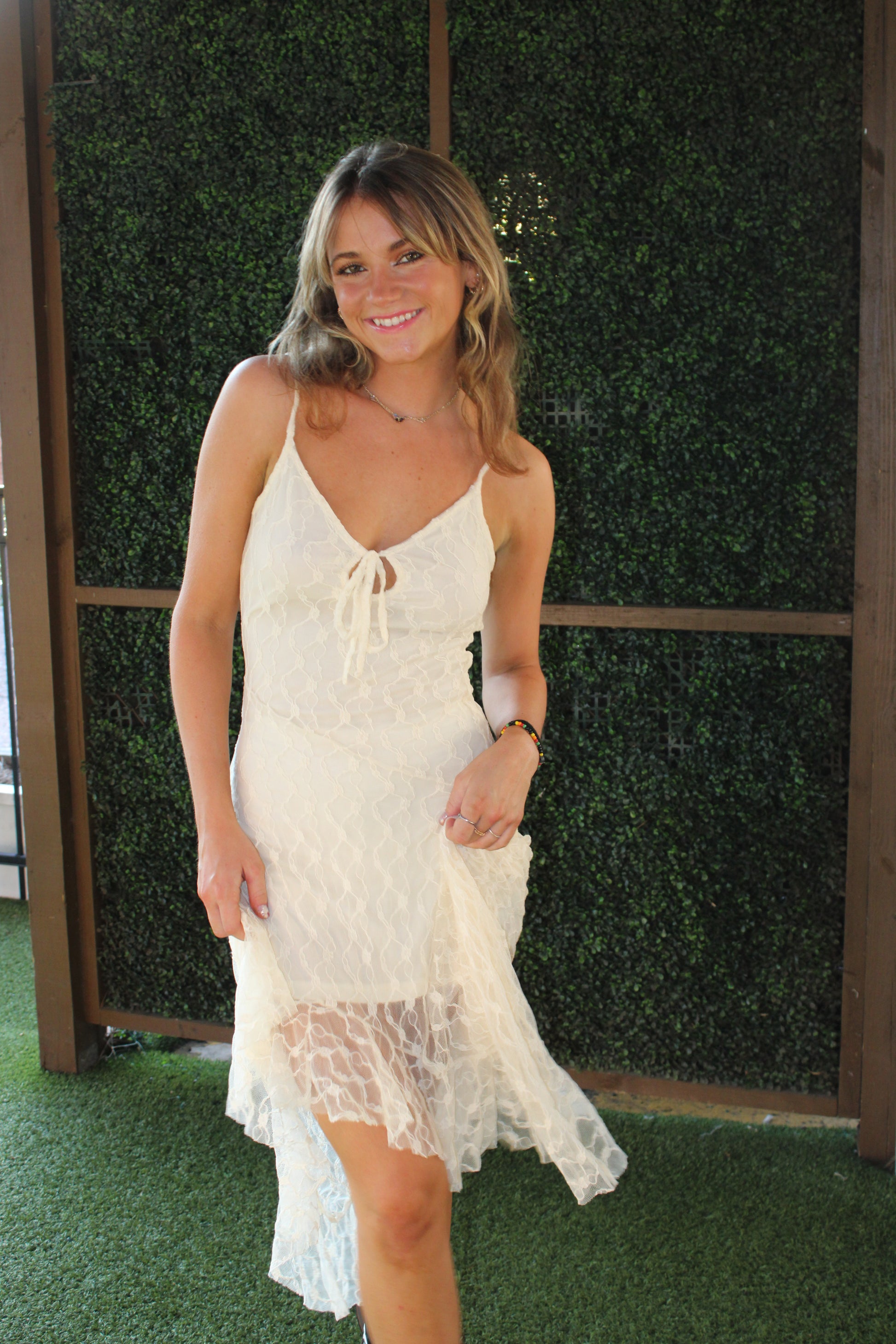 Sheer lace cami dress with a tie-front detail, V-neckline, and asymmetrical high-low hem.